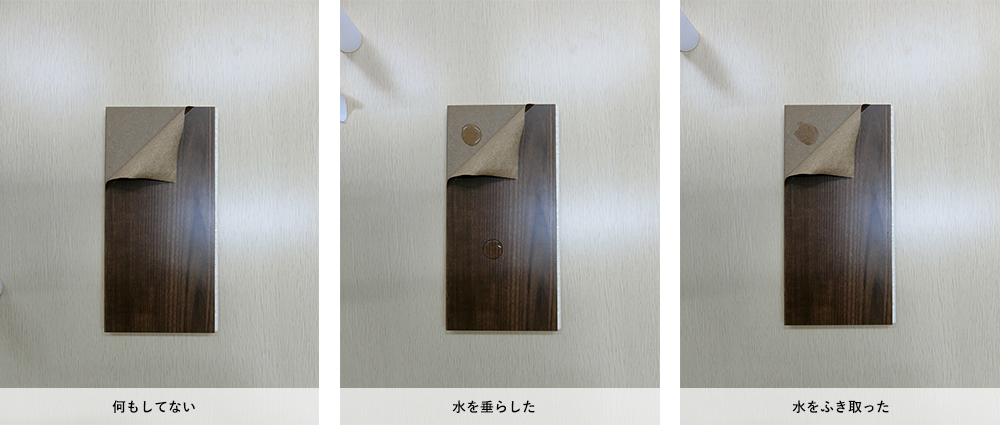 最近主流のシートフローリング(MDF(段ボールのような素材)の上に木目がプリントされたオレフィンシートを張ったフローリング)はオレフィンシートに特殊加工がされていて水を弾き、汚れが付きにくくなっております。